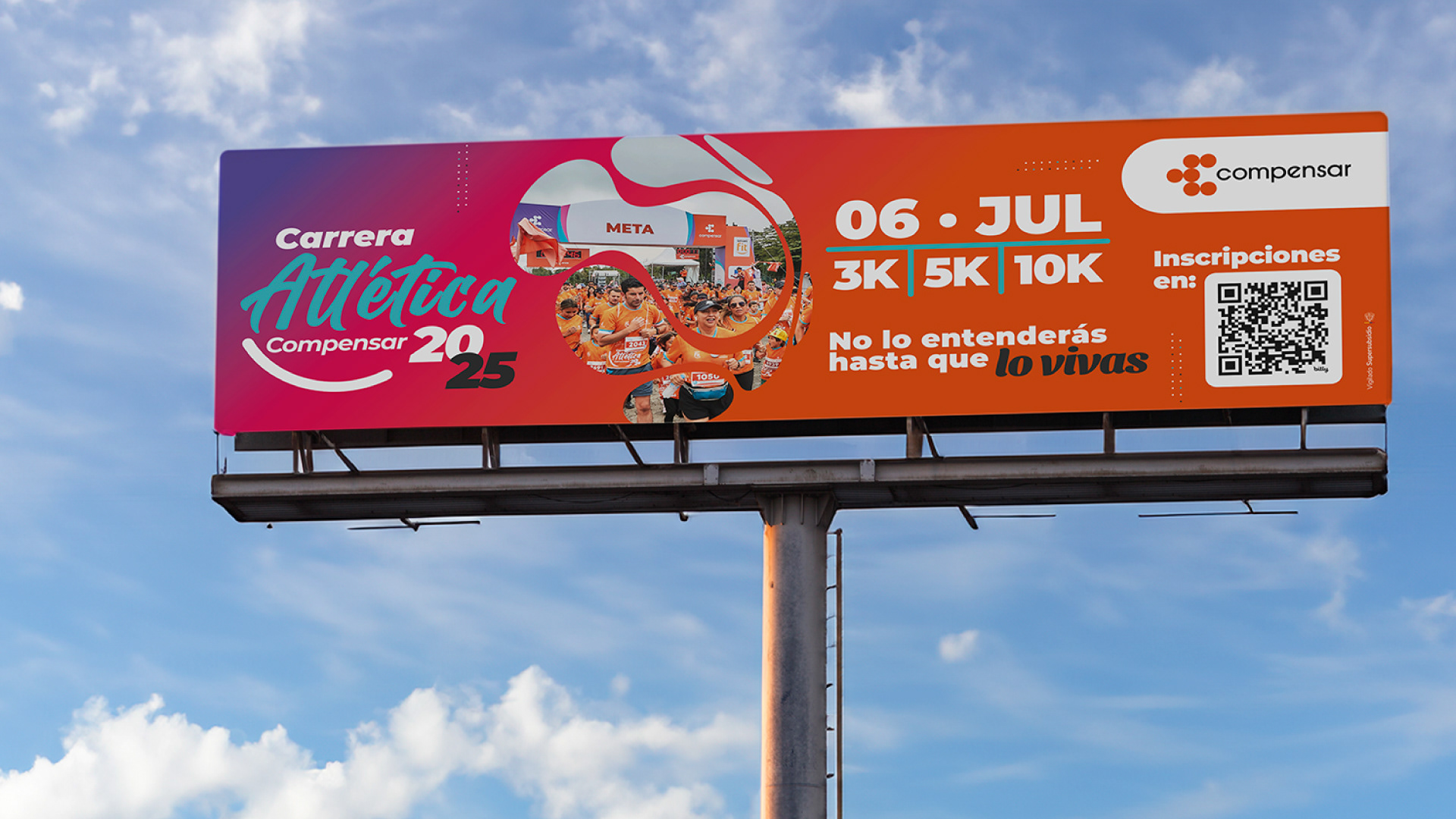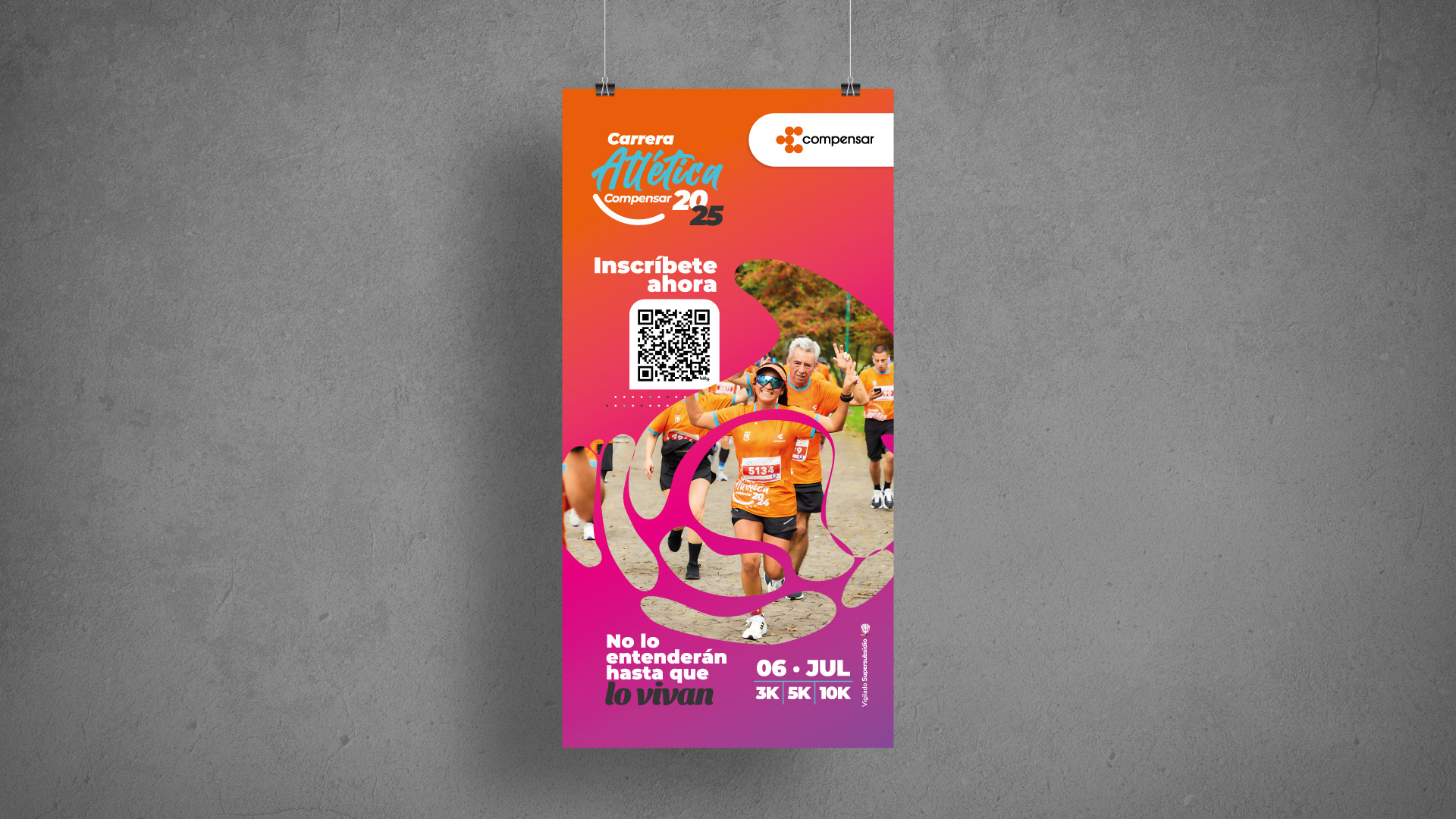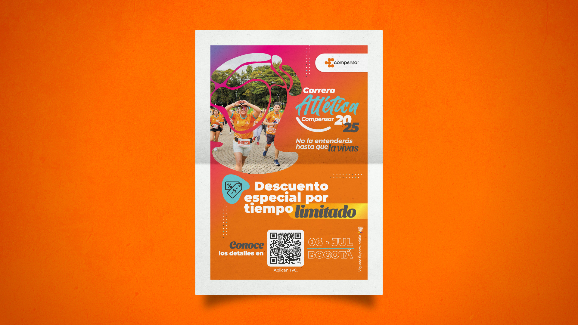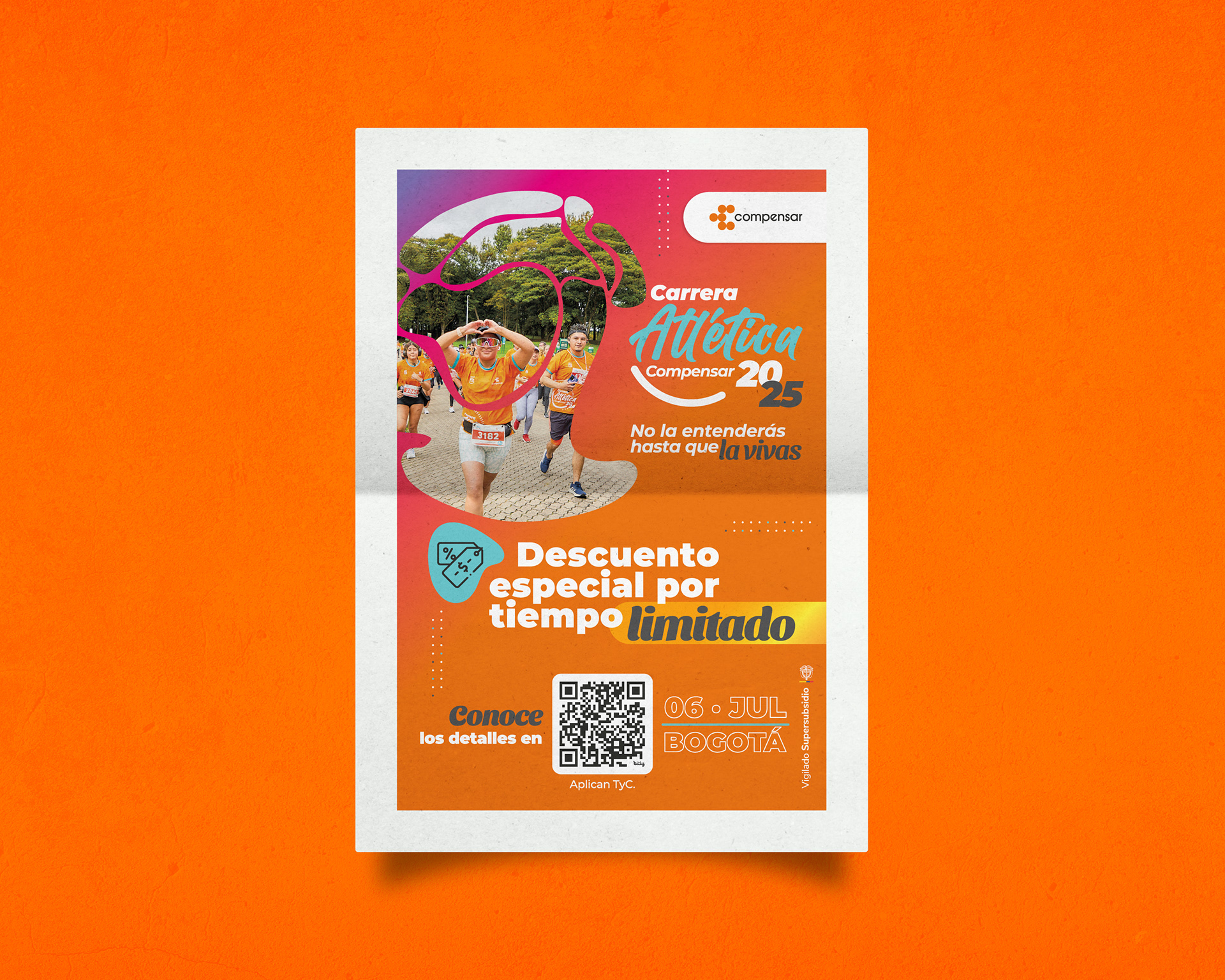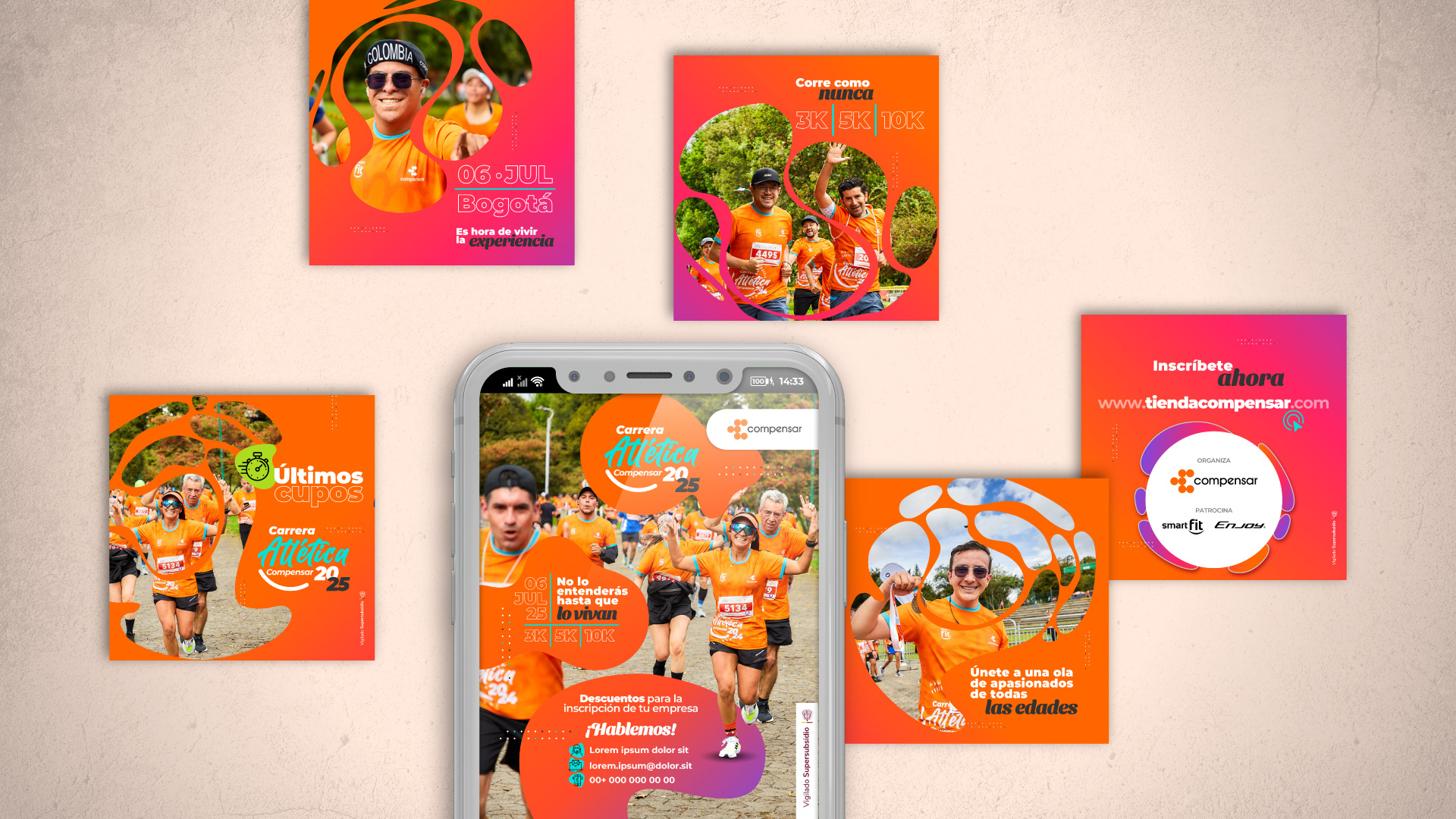 Diseño de piezas promocionales para la Carrera Atlética Compensar 2025, orientadas a canales digitales y físicos. La propuesta incluye contenidos para redes sociales, pendones, afiches, piezas interactivas y señalética, desarrollados bajo una línea gráfica vibrante y dinámica que evoca el espíritu deportivo del evento. Se utilizaron recursos visuales en tonos cálidos, tipografías de alto impacto y elementos gráficos que refuerzan el sentido de comunidad, movimiento y bienestar. Cada pieza fue diseñada para facilitar la divulgación, incentivar la inscripción y proyectar una imagen institucional coherente con los valores de Compensar. Este proyecto forma parte de nuestro portafolio en Behance como ejemplo de diseño aplicado a eventos deportivos corporativos.