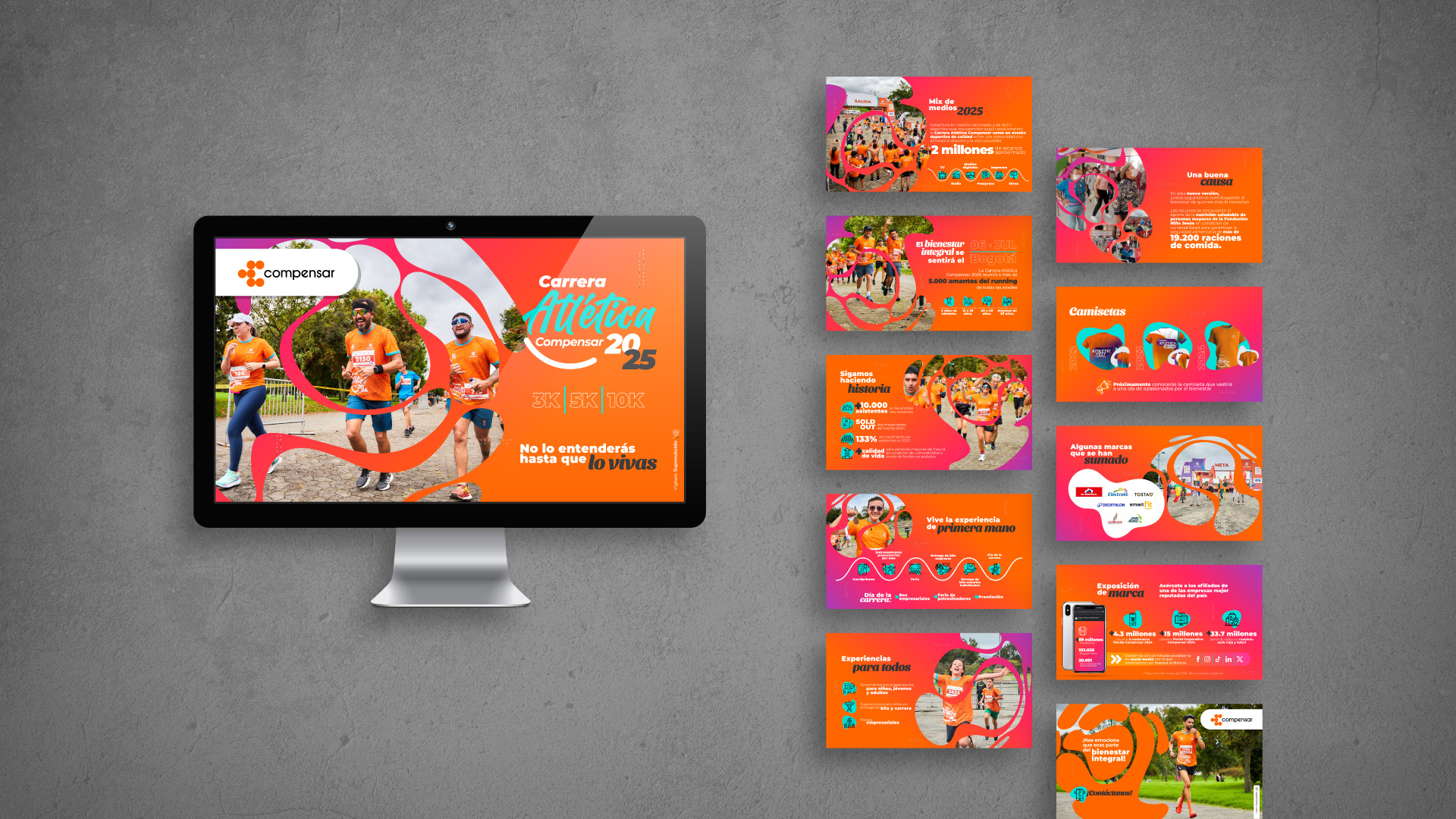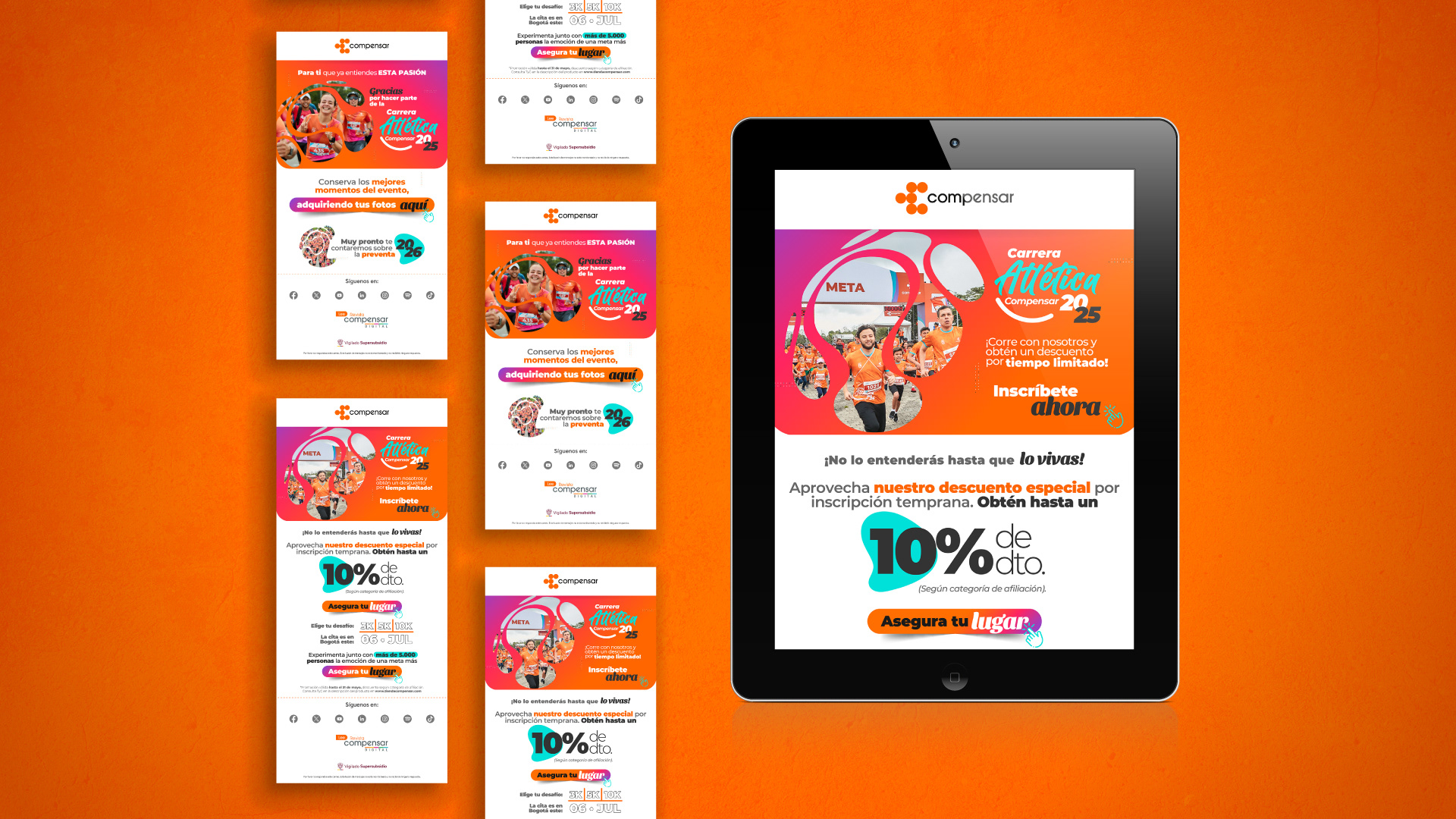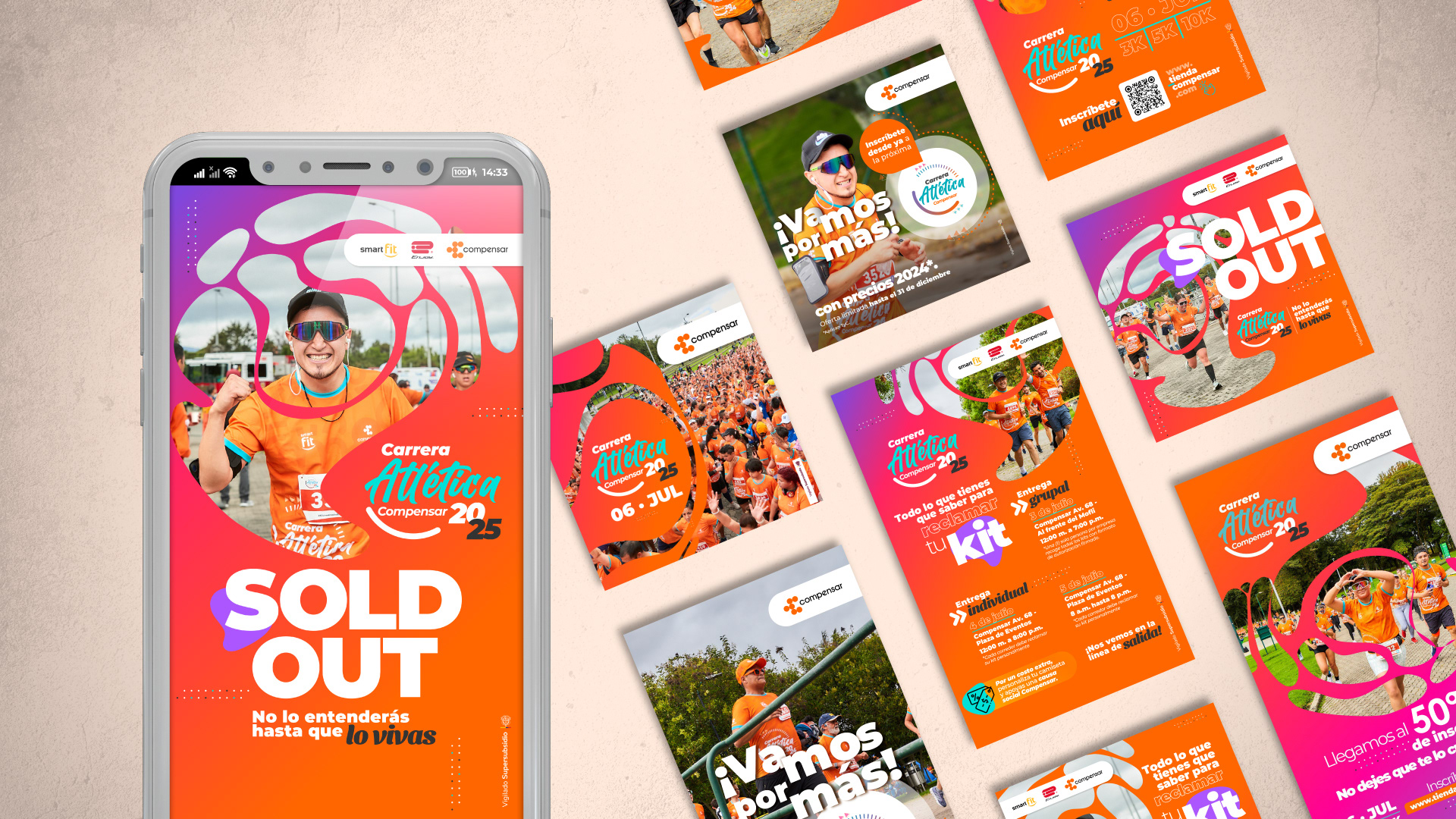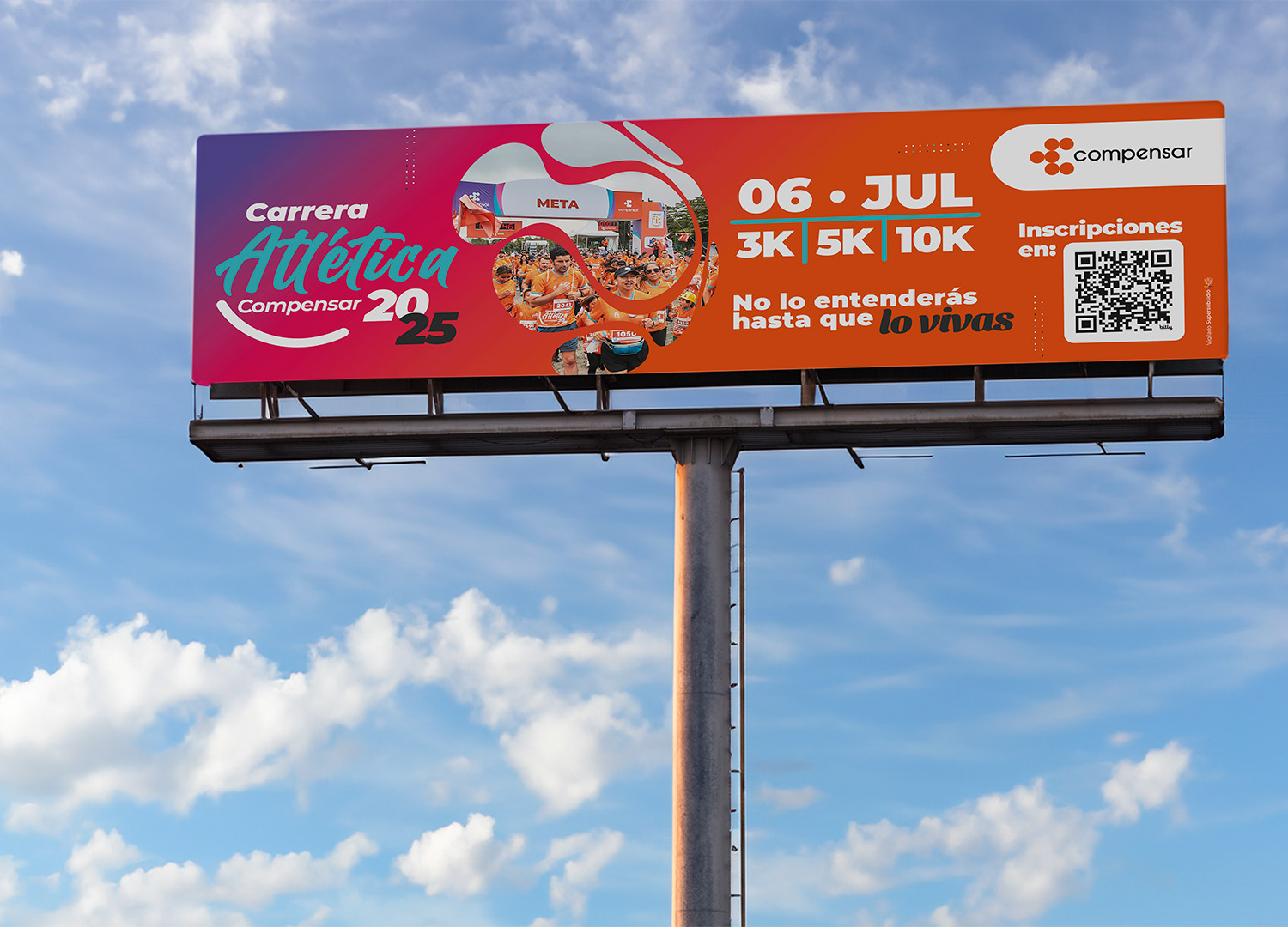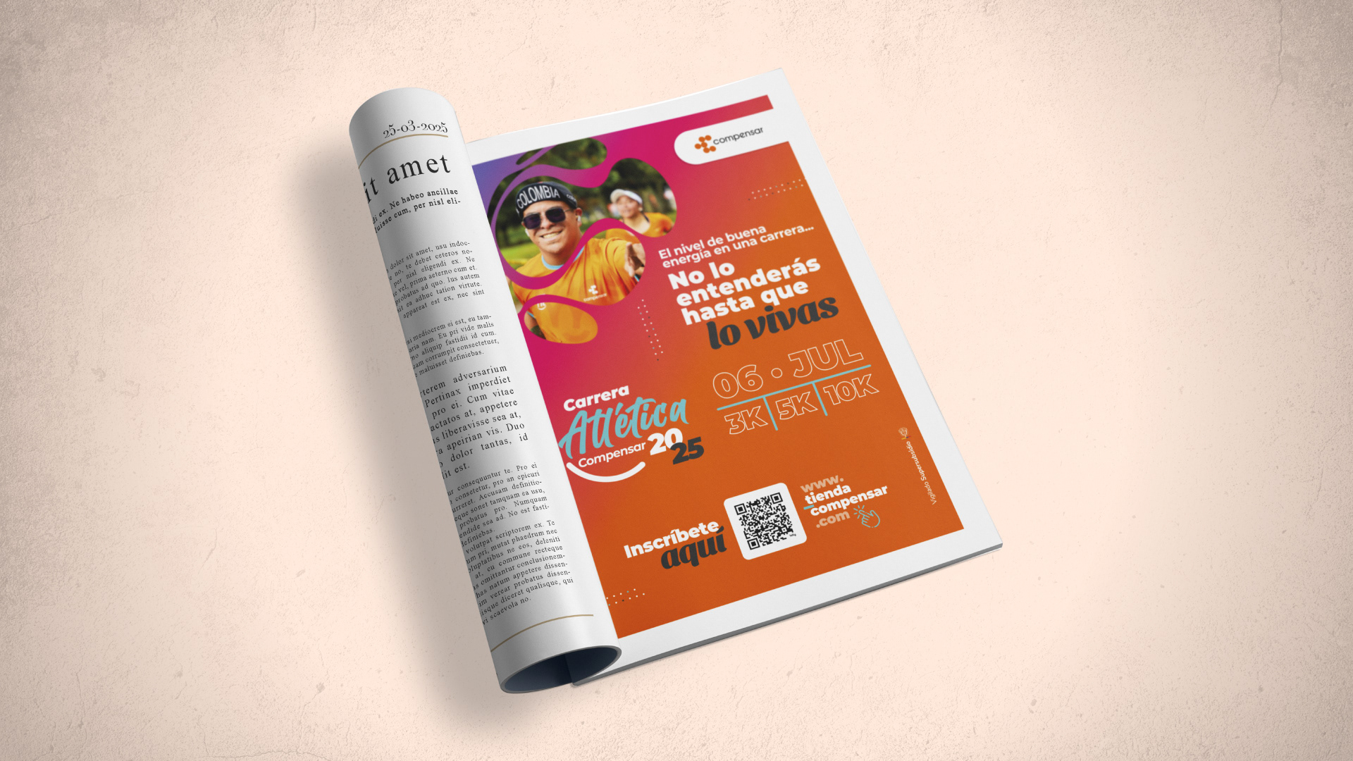 Diseño de piezas promocionales para la Carrera Atlética Compensar 2025, orientadas a canales digitales y físicos. La propuesta incluye contenidos para redes sociales, pendones, afiches, piezas interactivas y señalética, desarrollados bajo una línea gráfica vibrante y dinámica que evoca el espíritu deportivo del evento. Se utilizaron recursos visuales en tonos cálidos, tipografías de alto impacto y elementos gráficos que refuerzan el sentido de comunidad, movimiento y bienestar. Cada pieza fue diseñada para facilitar la divulgación, incentivar la inscripción y proyectar una imagen institucional coherente con los valores de Compensar. Este proyecto forma parte de nuestro portafolio en Behance como ejemplo de diseño aplicado a eventos deportivos corporativos.