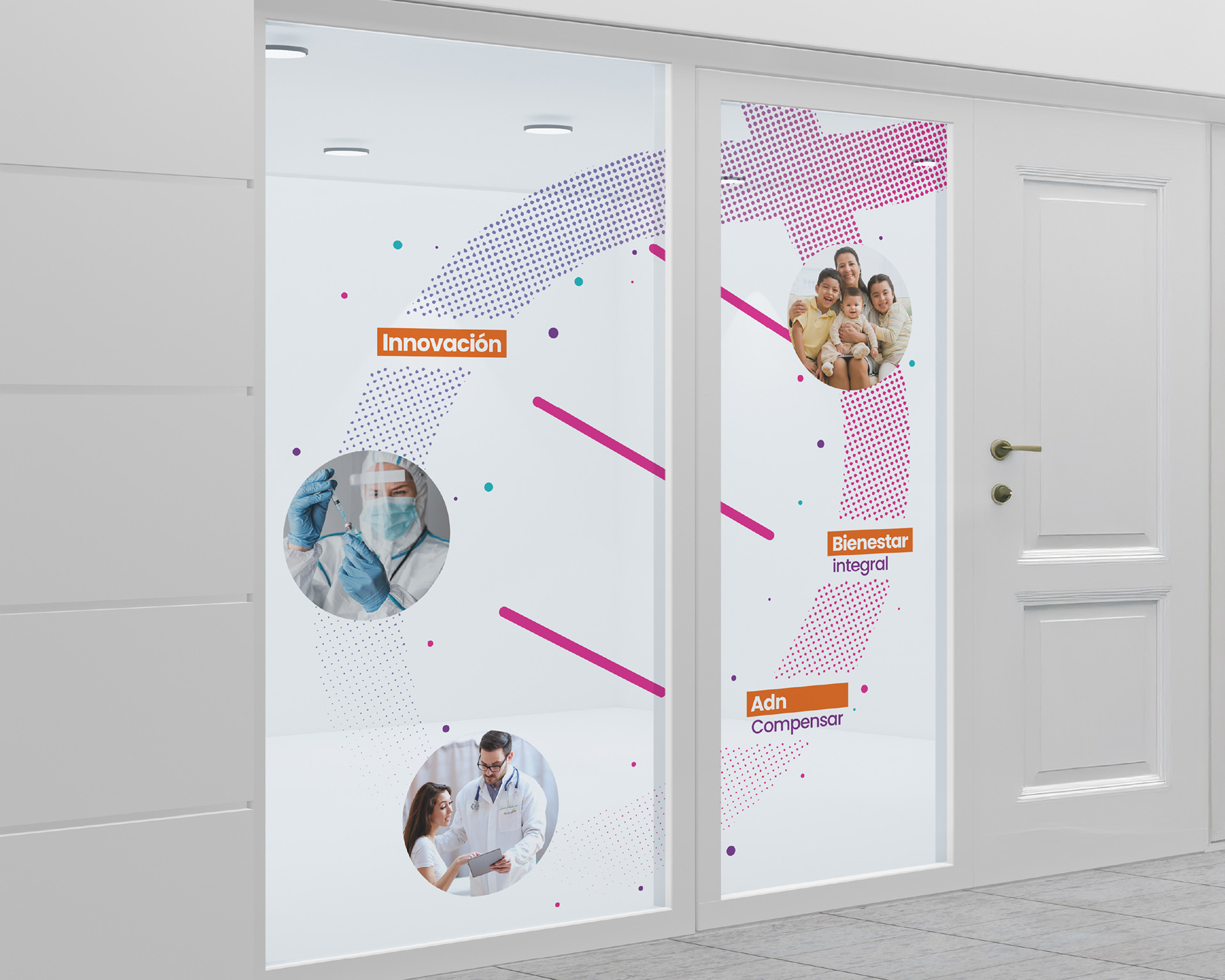 Proyecto de branding para zonas comunes en espacios colaborativos de Consorcio, enfocado en fortalecer la identidad visual interna. Se desarrollaron piezas gráficas aplicadas en muros, salas y ventanas, utilizando la paleta cromática y tipografías corporativas para generar coherencia visual y sentido de pertenencia. El diseño integra elementos alusivos al ADN como símbolo de conexión entre colaboradores, creando una experiencia estética que comunica valores, propósito y cultura organizacional.