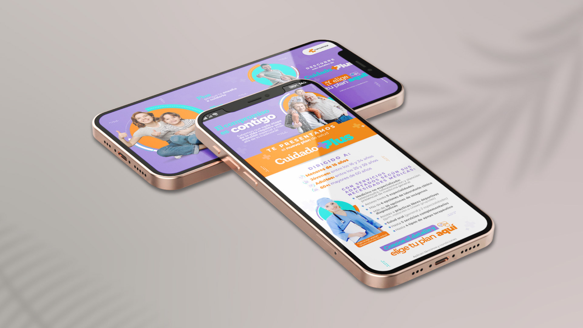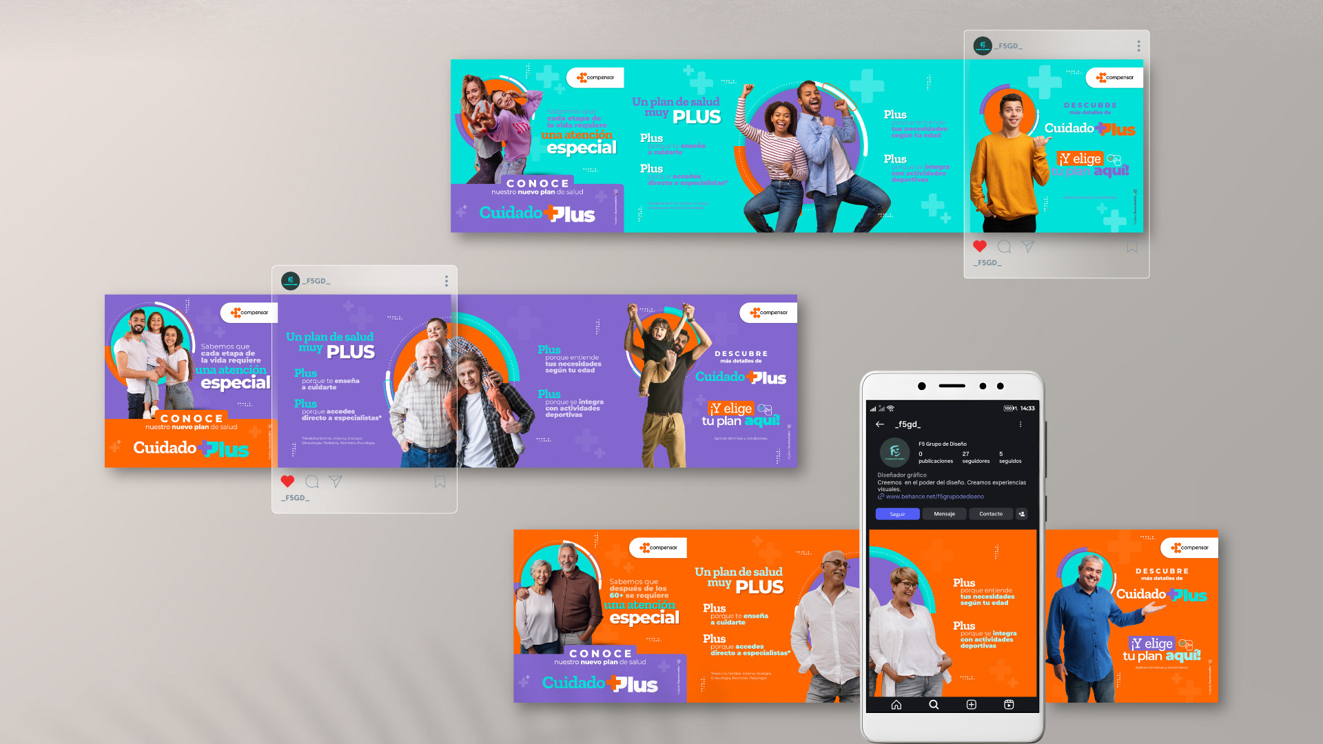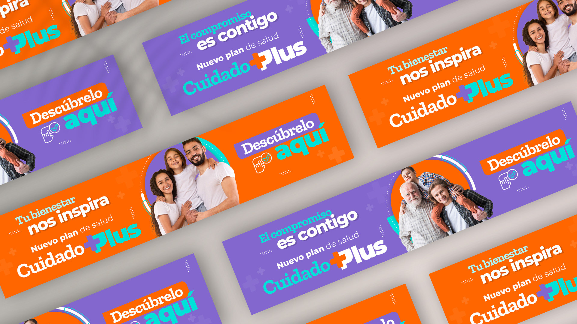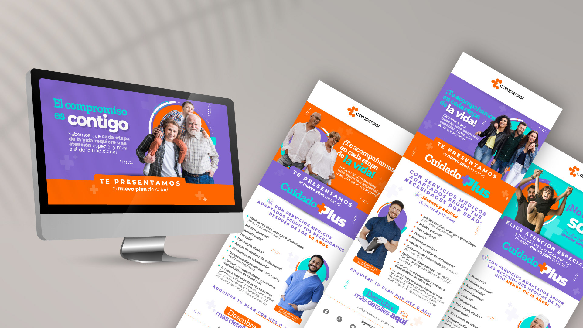Para el lanzamiento de Cuidado Plus, el nuevo paquete básico de salud de Compensar Salud, desarrollamos una identidad visual clara, moderna y coherente, basada en la aplicación estratégica de los colores corporativos. El sistema gráfico se construyó para transmitir cercanía, accesibilidad y confianza, manteniendo alineación con los lineamientos institucionales y reforzando el posicionamiento del programa dentro del portafolio de servicios.