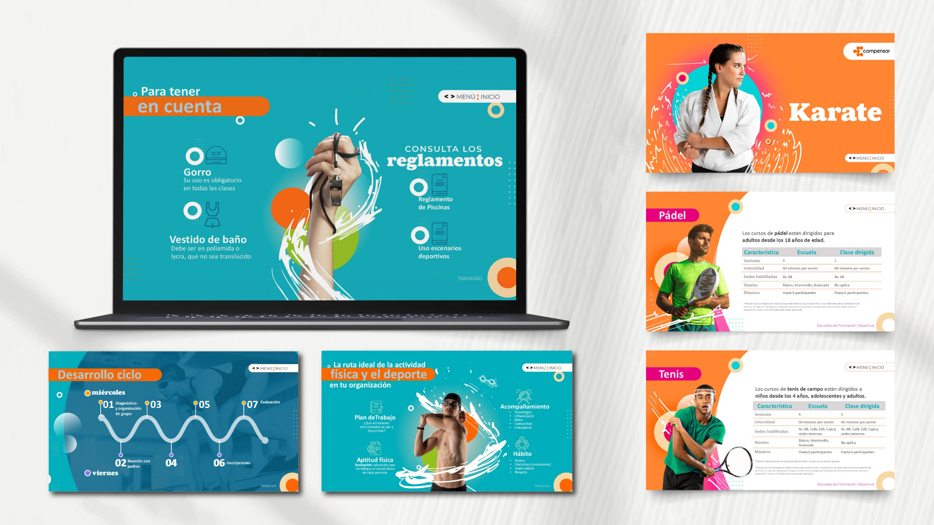 Diseñamos una serie de portafolios digitales para programas de recreación y deporte, segmentados por categorías y diferenciados por color según los lineamientos corporativos. Cada pieza fue desarrollada con una estética dinámica que incorpora trazos ilustrativos sobre las imágenes, aportando movimiento, energía y coherencia visual. El objetivo fue presentar de forma clara y atractiva la oferta de servicios deportivos a usuarios y empresas aliadas, facilitando su uso en entornos digitales, presentaciones institucionales y procesos de vinculación. Este proyecto forma parte de nuestro portafolio en Behance como ejemplo de diseño aplicado a comunicación sectorial.