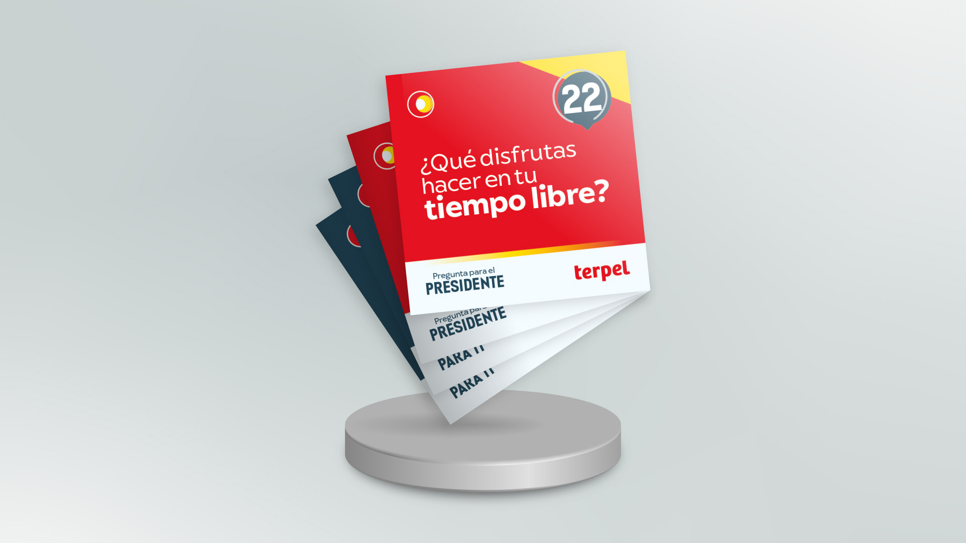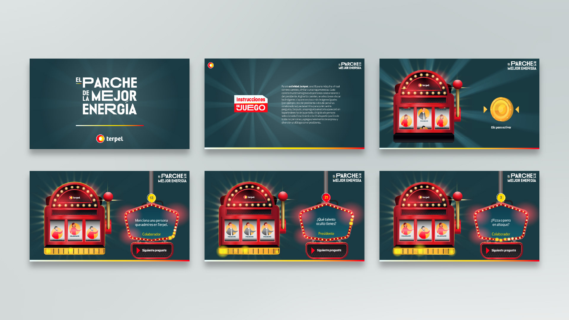Experiencia Lúdica Física y Virtual Cliente: Terpel Colombia -2025 Transformar una idea en una experiencia tangible fue el propósito detrás de “Juego Presidente”, una dinámica creada por Terpel para conectar y motivar a sus colaboradores. Nuestro equipo se encargó de dar vida visual y funcional a la propuesta, diseñando y produciendo el kit físico —dado y tarjetas personalizadas— con una identidad gráfica sólida y alineada con la marca. Posteriormente, desarrollamos la dinámica digital tipo jackpot, que trasladó el juego físico a una versión virtual interactiva, manteniendo su espíritu lúdico y participativo. El resultado es una experiencia integral que une diseño, producción y tecnología para convertir la comunicación interna en un momento de juego y conexión auténtica.