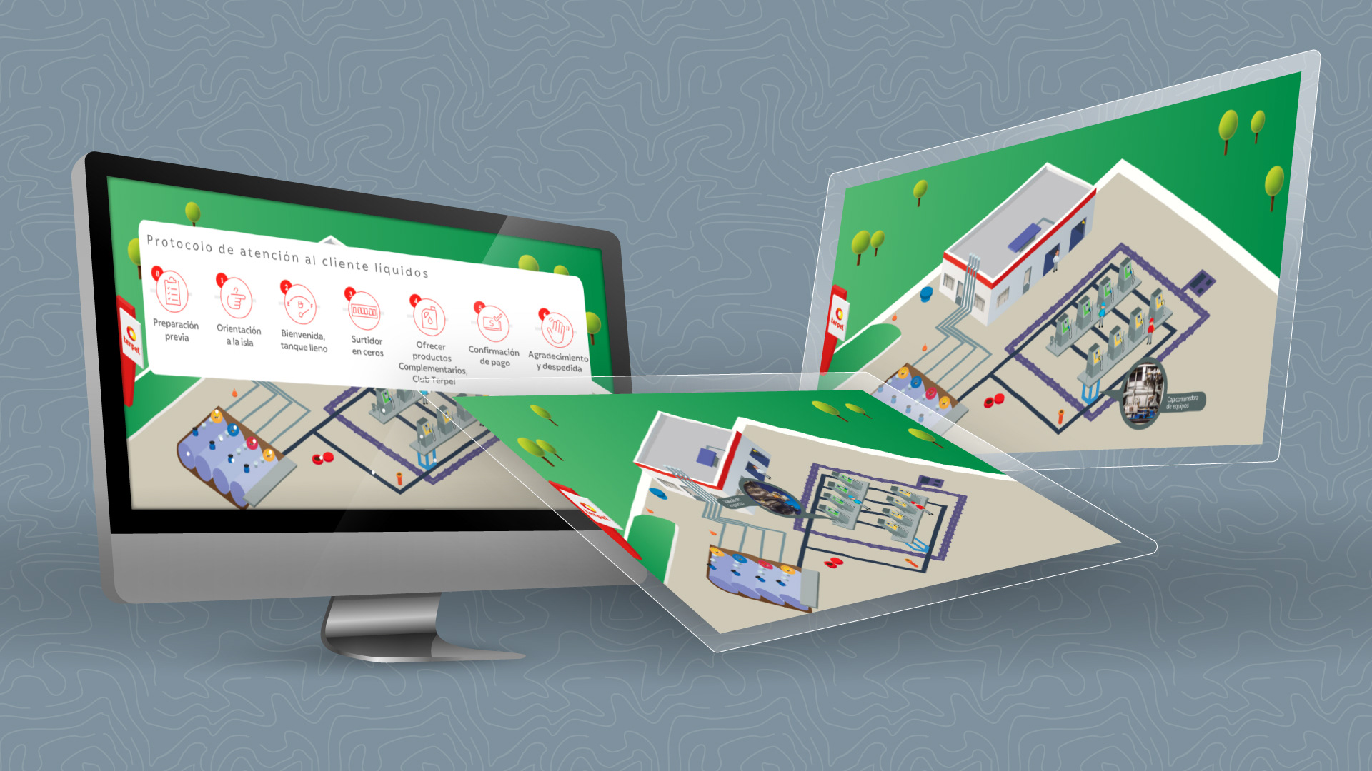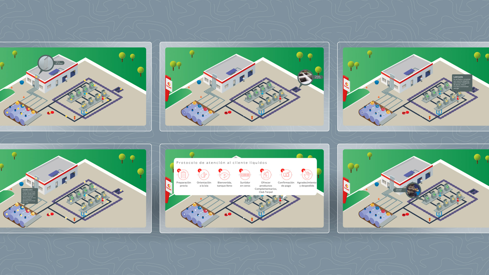 Un interactivo que, mediante ventanas pop-up, permite identificar las áreas estratégicas dentro de una estación de servicio. Esta herramienta facilita que los participantes reconozcan los puntos críticos del entorno operativo, promoviendo una comprensión espacial del servicio y sus componentes.